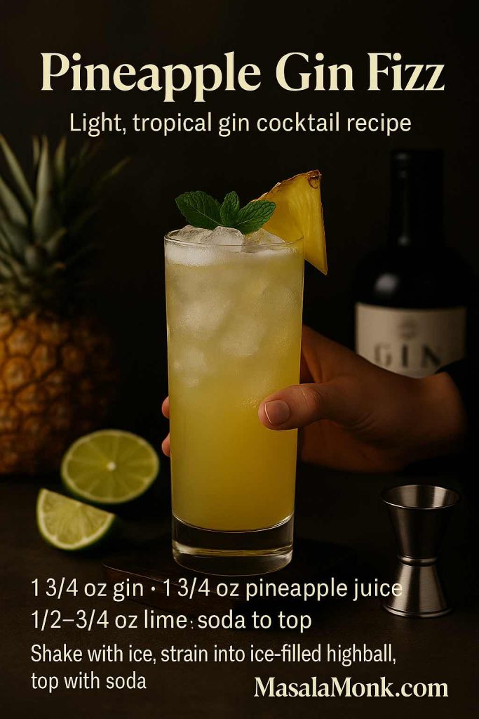 Pineapple Gin Fizz – a light, tropical gin cocktail recipe card from MasalaMonk.com featuring a simple 1 3/4 oz gin, 1 3/4 oz pineapple juice and lime formula topped with soda for easy summer sipping.