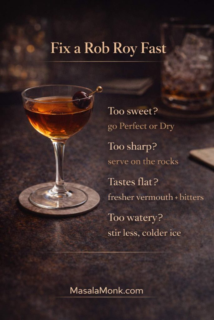 Move toward a perfect Rob Roy recipe or a dry Rob Roy. Those variations are designed for exactly this preference. They change the drink’s balance without changing its identity.